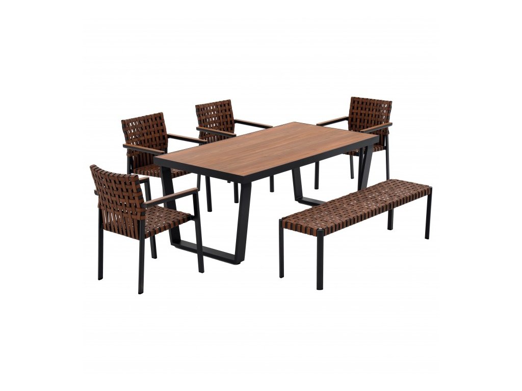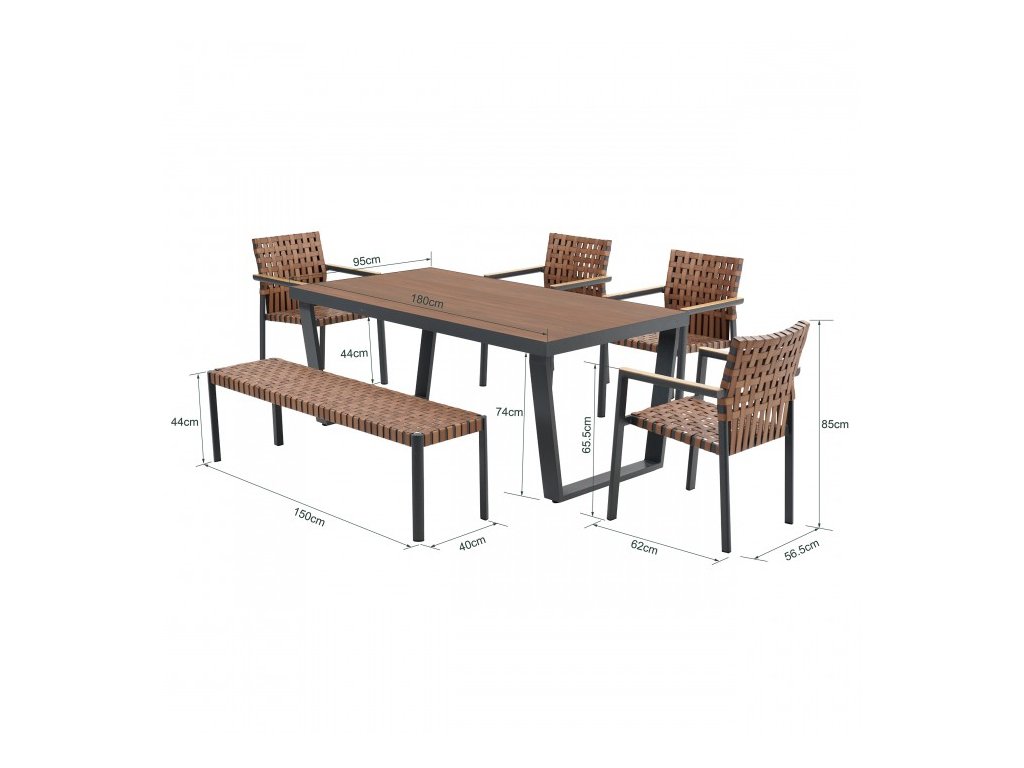 Súprava jedálenského nábytku pre 6 osôb v štýle modern country je skvelou voľbou pre každého, kto obľubuje pokojnú, vidiecku atmosféru a originálne riešenia. Set obsahuje veľký stôl, štyri stoličky a lavicu, ktoré môžeš ľubovoľne rozmiestniť podľa priestoru. Robustná hliníková konštrukcia upravená práškovým lakovaním zvyšuje odolnosť a stabilitu nábytku. Sedenia z polyratanu prinášajú pohodlie a príjemný pocit pri každom posedení.
