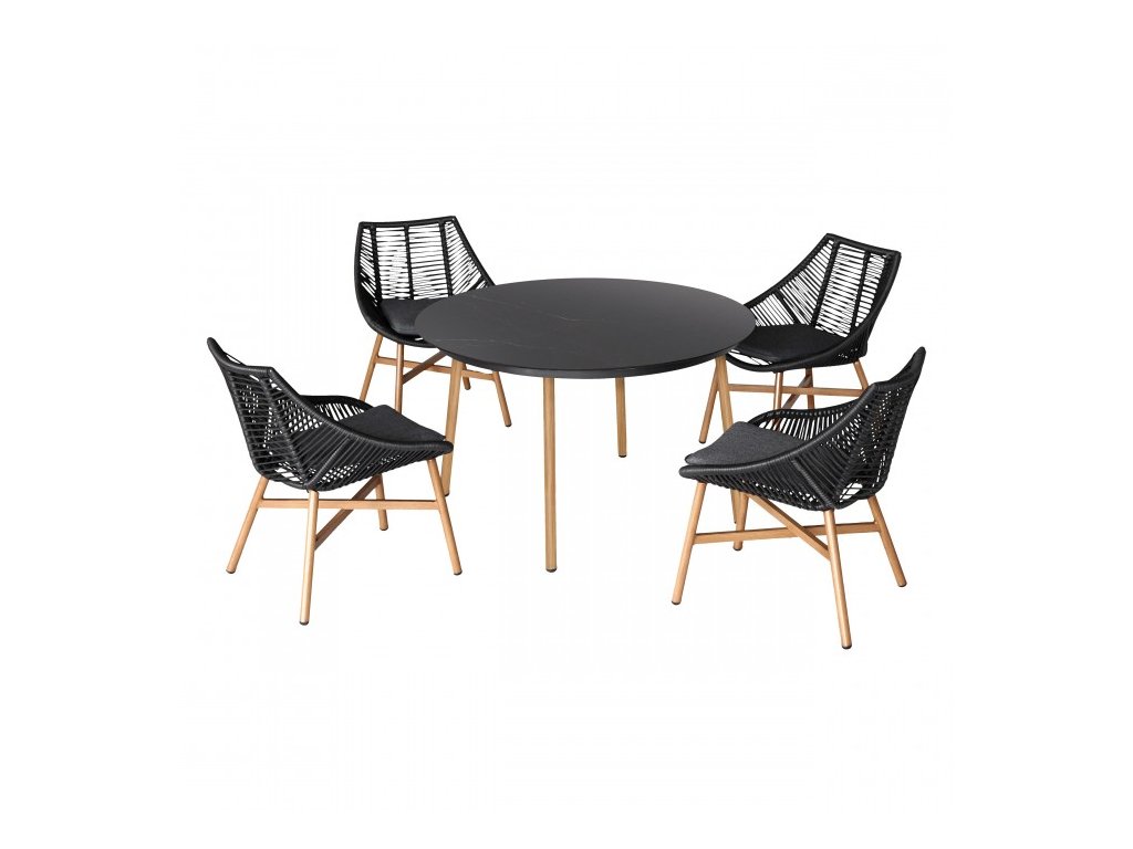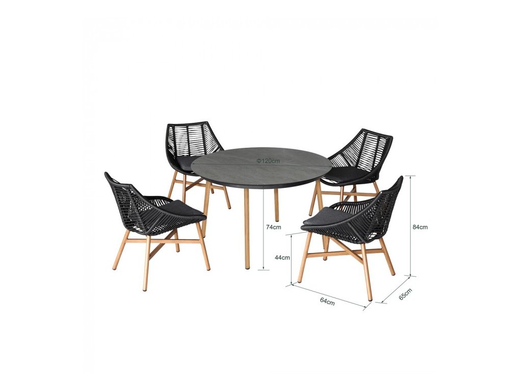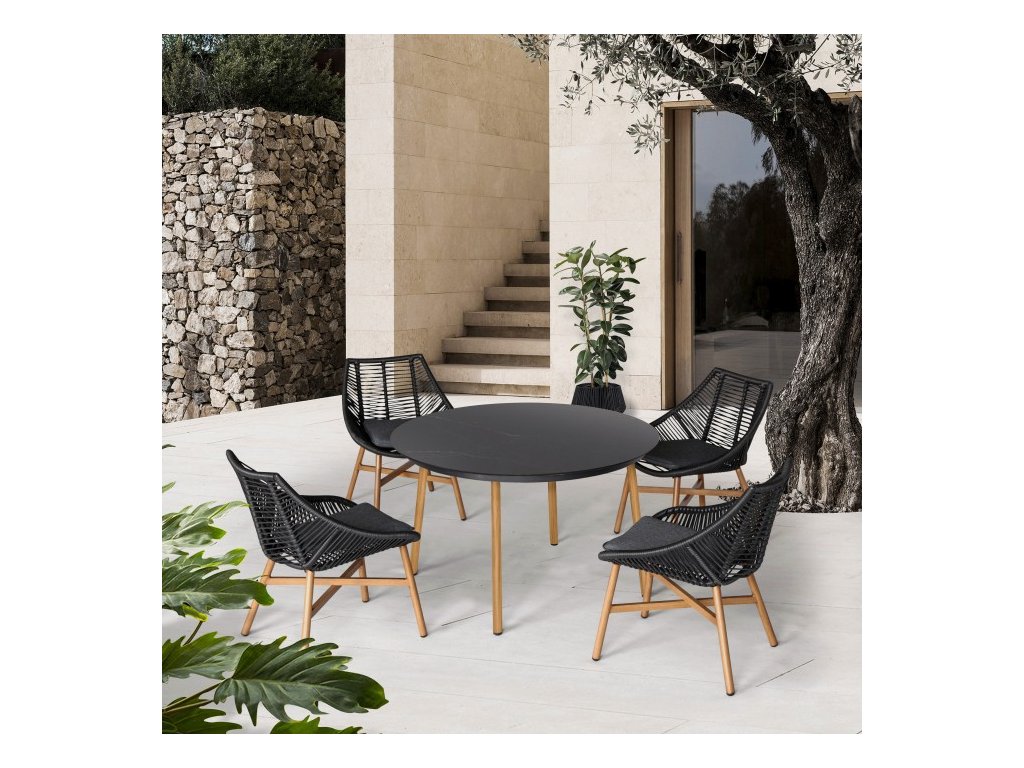 Dominantou zostavy je veľký okrúhly stôl s doskou zo spekaného kameňa, ktorý vyniká vysokou odolnosťou voči poškriabaniu, vlhkosti aj teplotným výkyvom. Stabilná hliníková konštrukcia zaručuje nízku hmotnosť, pevnosť a dlhú životnosť bez korózie.