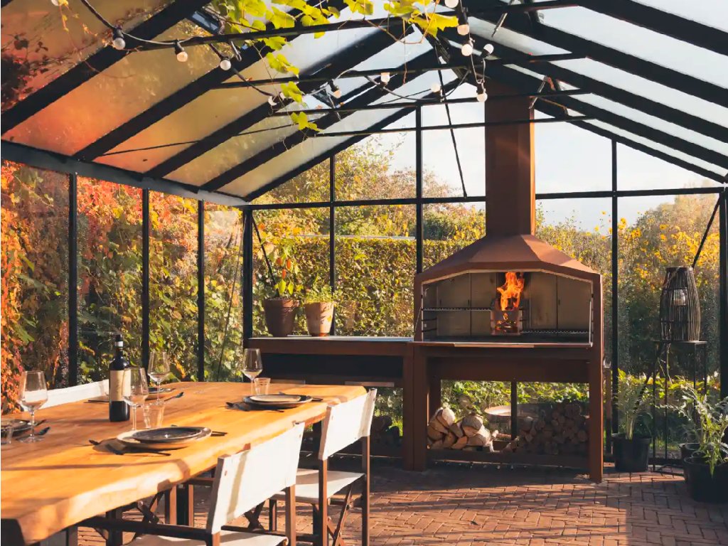 Multifunkčné dvierka slúžia nielen na zatváranie ohniska, ale aj ako praktická pracovná plocha počas prípravy. Vysoký komín s integrovanou klapkou na reguláciu ťahu zaručuje spoľahlivý odvod dymu a jednoduché ovládanie spaľovacieho procesu.