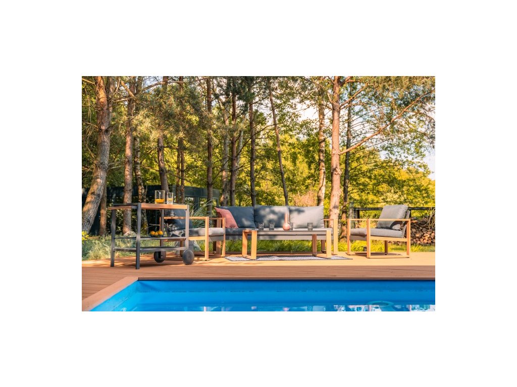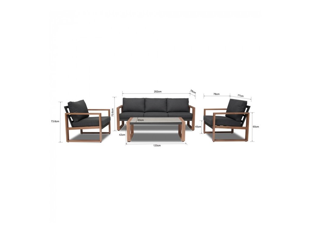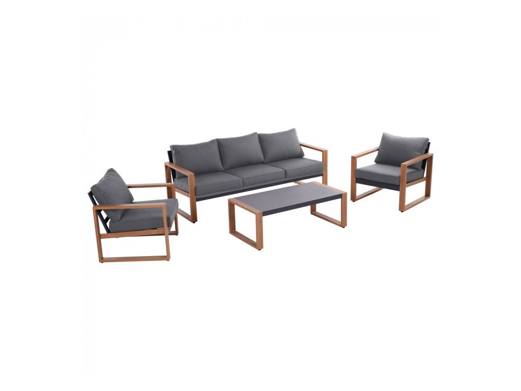 Set obsahuje 3-miestnu pohovku, 2 komfortné kreslá a praktický stôl s doskou z tvrdeného skla. Vďaka premysleným tvarom a kvalitným materiálom poskytuje stabilitu, odolnosť a pohodlie na každodenné používanie. Hliníkový rám je chránený lakovaním so štruktúrou dreva, ktoré zvyšuje estetiku a zároveň chráni povrch pred poveternostnými vplyvmi.