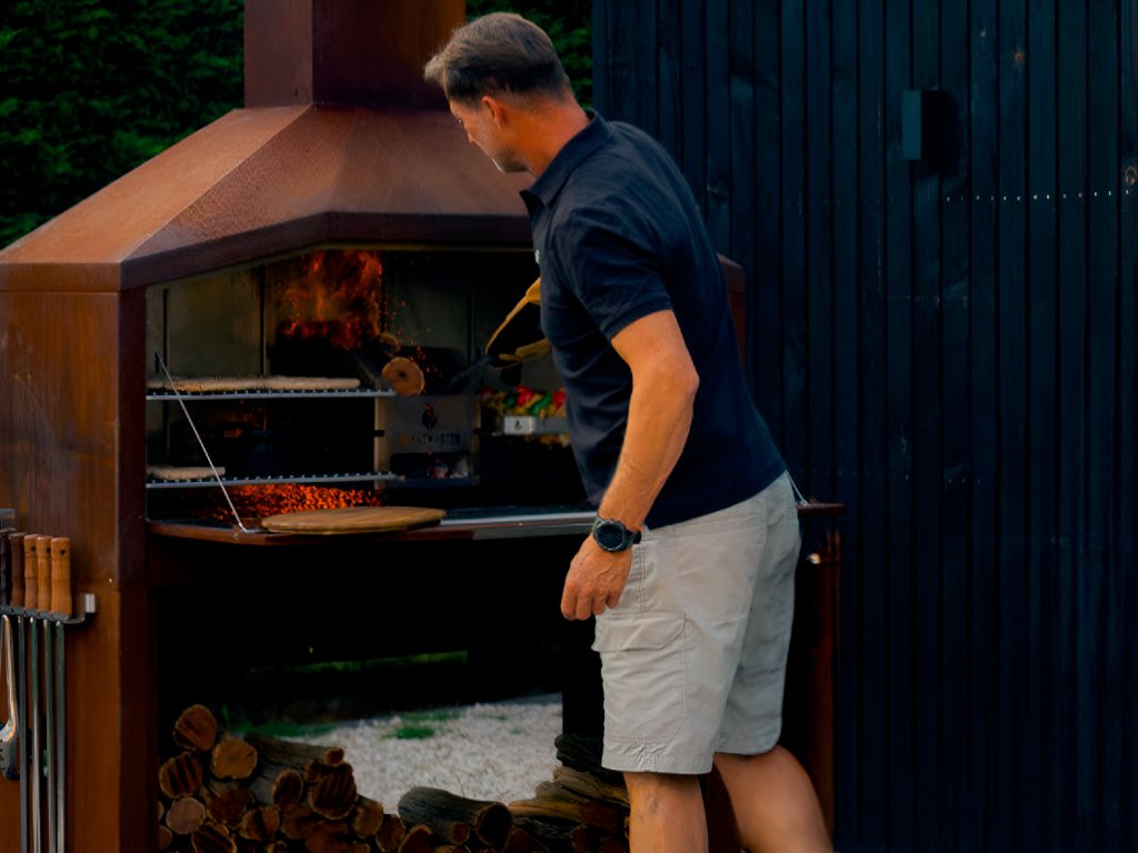 Telo grilu je vyrobené z odolnej cortenovej ocele CORTEN® A, ktorá časom vytvára prirodzenú patinu – nielenže krásne vyzerá, ale poskytuje aj dlhodobú ochranu voči poveternostným podmienkam. Interiér je z hygienickej nerezovej ocele 304, ktorá je mimoriadne odolná voči vysokým teplotám a zároveň ľahko udržiavateľná. Celá konštrukcia je dvojplášťová, čo zabezpečuje vynikajúcu izoláciu, bezpečnosť a úsporu tepla.