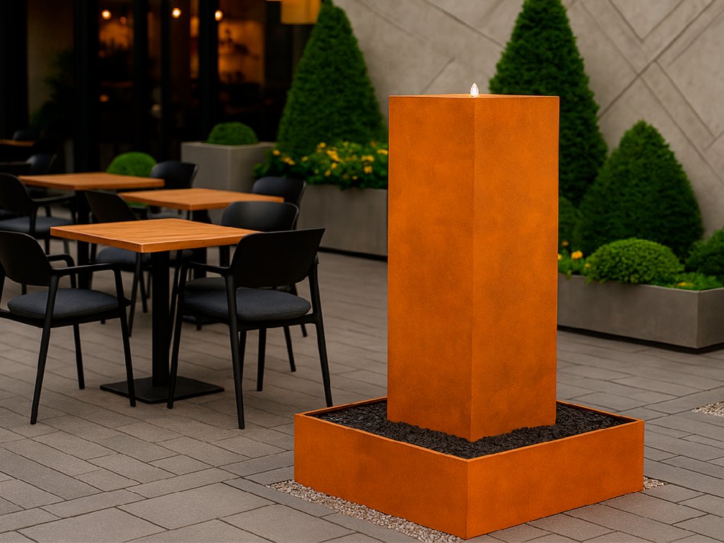 Cortenová oceľ, z ktorej je fontána vyrobená, je vysoko odolný konštrukčný materiál známy tým, že pri vystavení poveternostným vplyvom vytvára stabilnú hrdzavú patinu. Táto patina nie je znakom opotrebovania – práve naopak, ide o prirodzenú ochrannú vrstvu, ktorá bráni ďalšej korózii. Vďaka tomu sú výrobky z cortenu prakticky bezúdržbové a majú dlhú životnosť.
