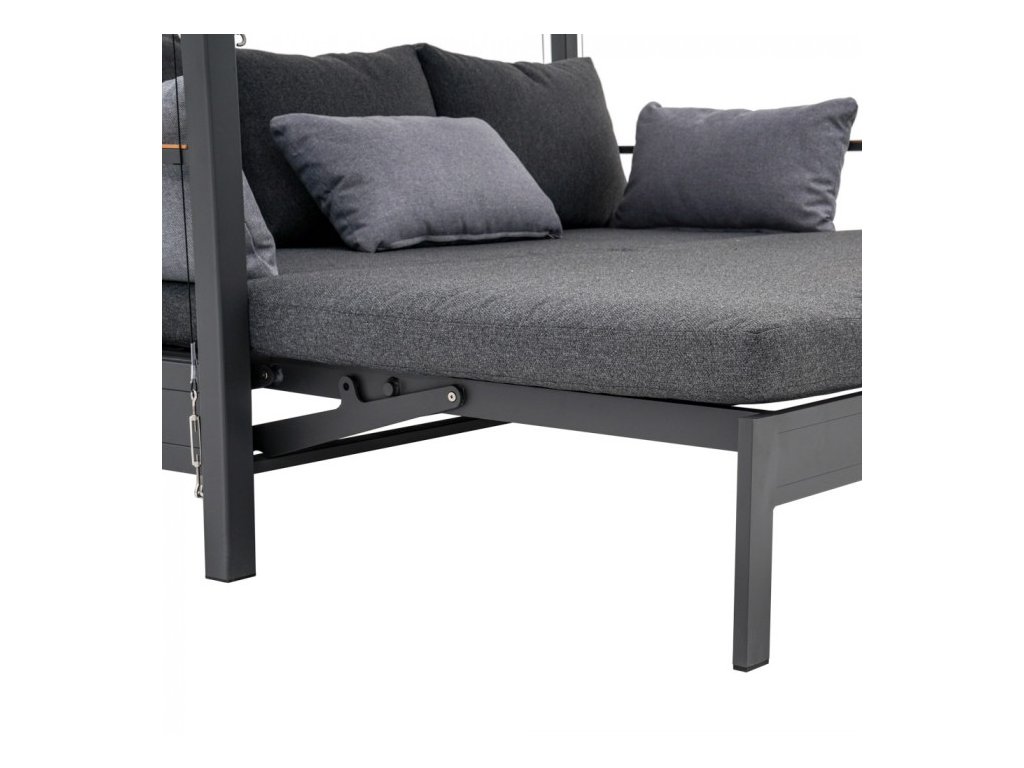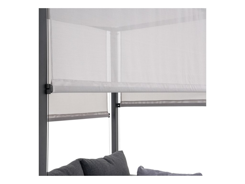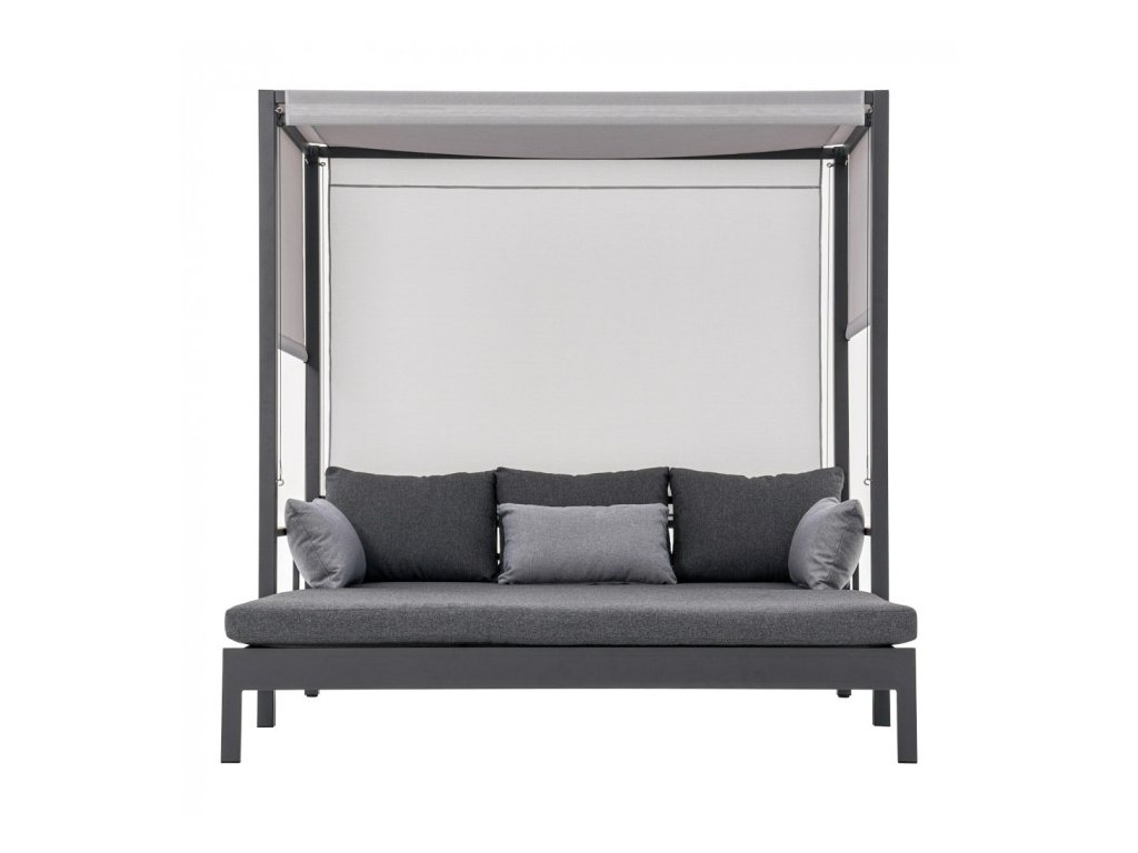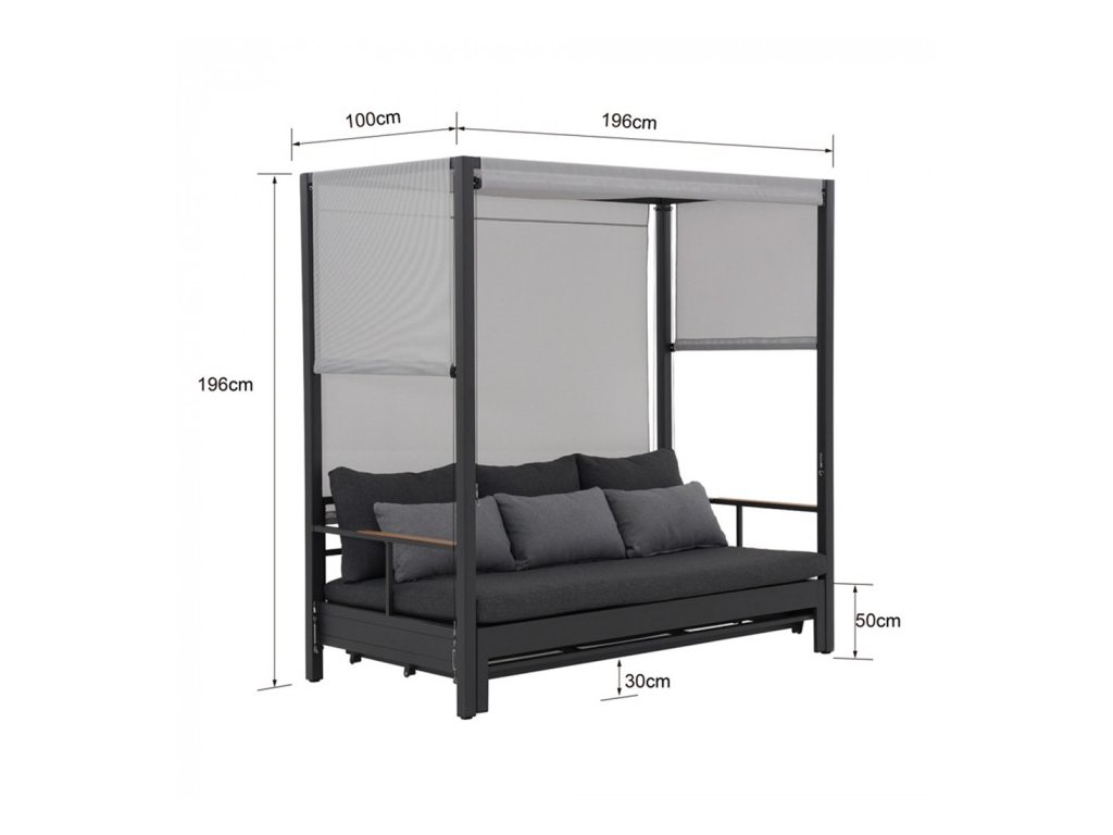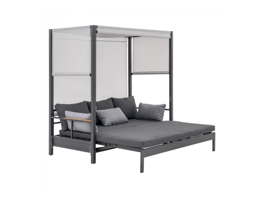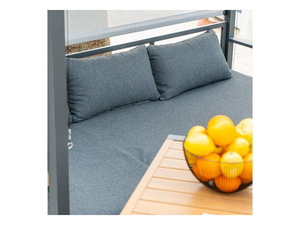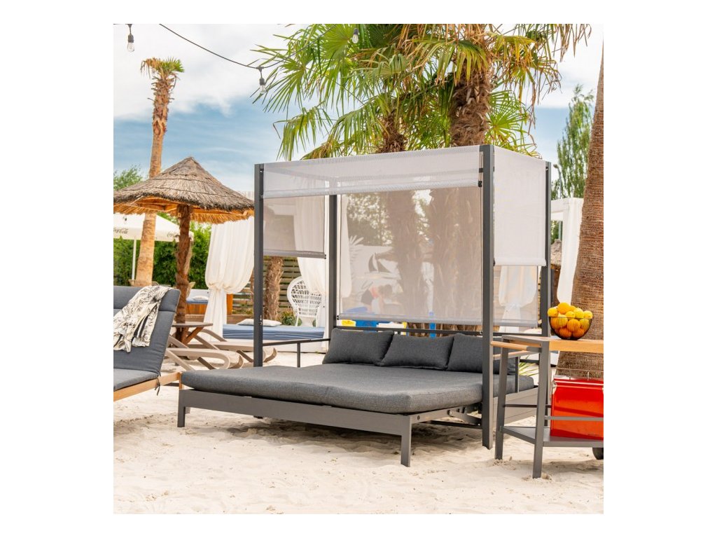 Lôžko dopĺňajú mäkké polyesterové podušky, ktoré zabezpečujú maximálne pohodlie pri ležaní. Ich materiál je nenáročný na údržbu, odolný voči vlhkosti a rýchlo schne, takže je vhodný na pravidelné používanie v exteriéri. Vrcholným prvkom je rozkladací baldachýn, ktorý ponúka príjemné zatienenie v horúcich dňoch a zároveň dodáva celému lôžku estetický a moderný charakter.
