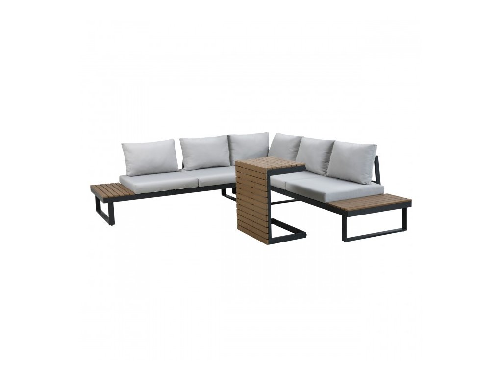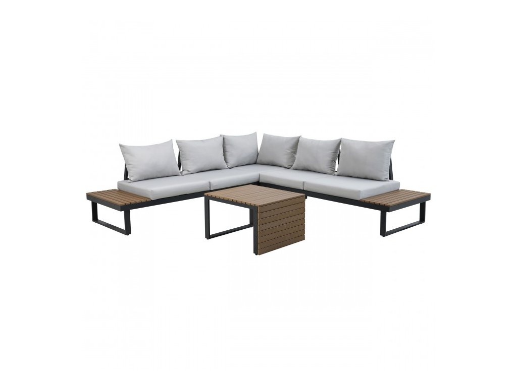 Výhody produktu: odolný hliníkový rám s práškovou úpravou, detailné vyhotovenie s Polywood lamelami, komfortné podušky, flexibilný kávový stolík, moderný vzhľad ideálny pre terasy a záhrady.