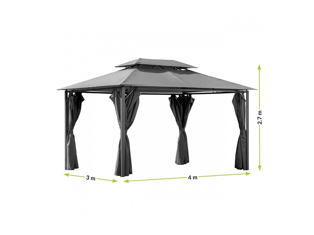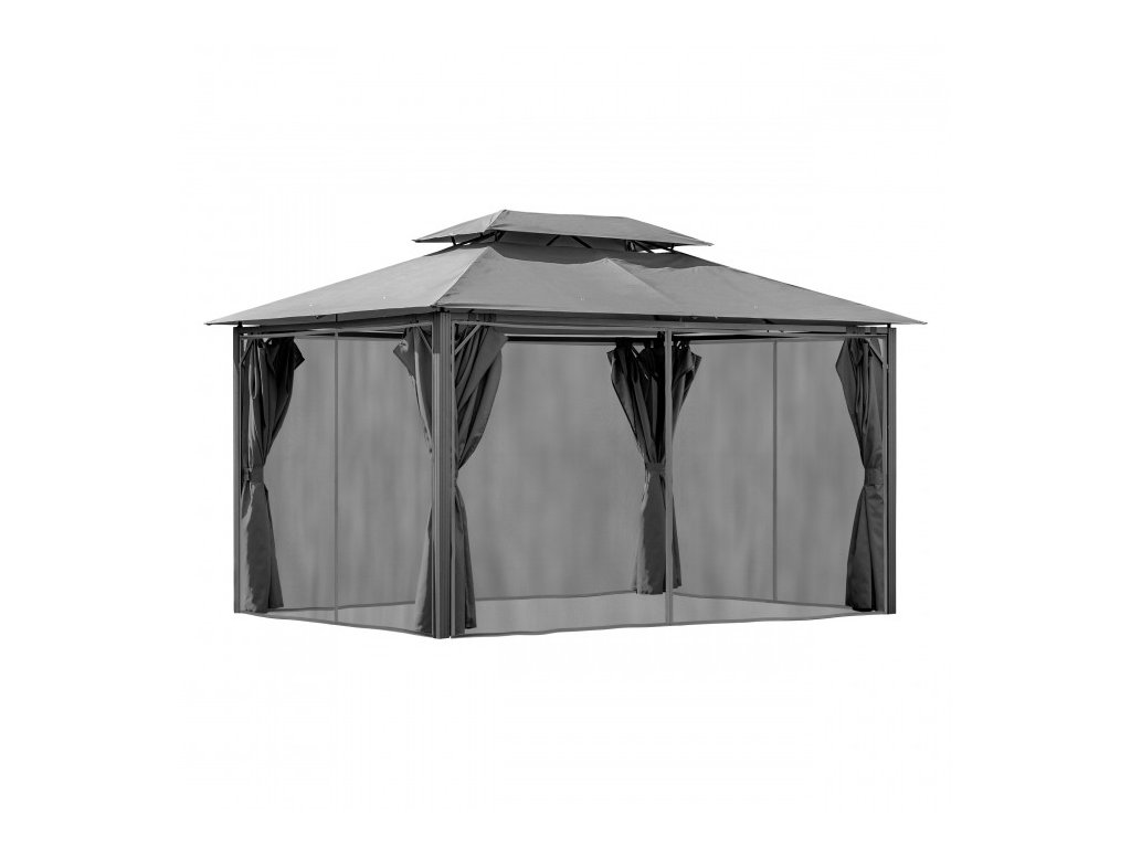 Záhradný pavilón Tino 3 x 4 m so stenami a moskytiérou je funkčným riešením pre zastrešenie väčších oddychových priestorov v záhrade alebo na terase. Kombinácia hliníkových nôh a oceľových nosníkov poskytuje vysokú stabilitu konštrukcie a zároveň zabezpečuje zvýšenú odolnosť voči korózii pri dlhodobom vonkajšom používaní.