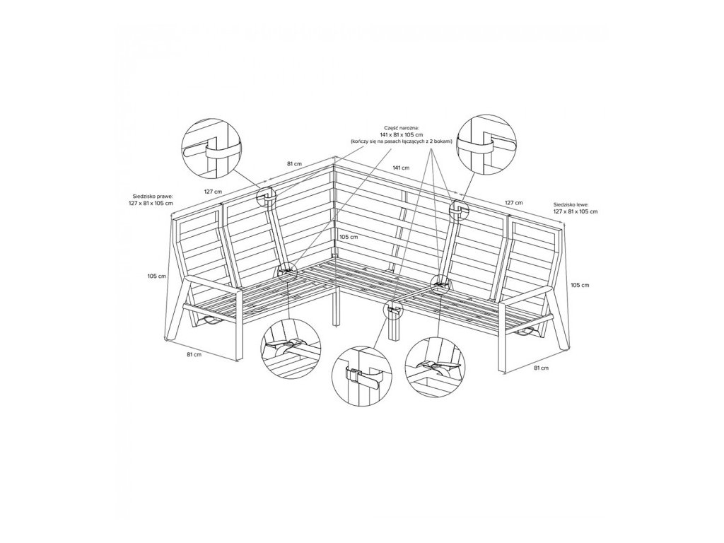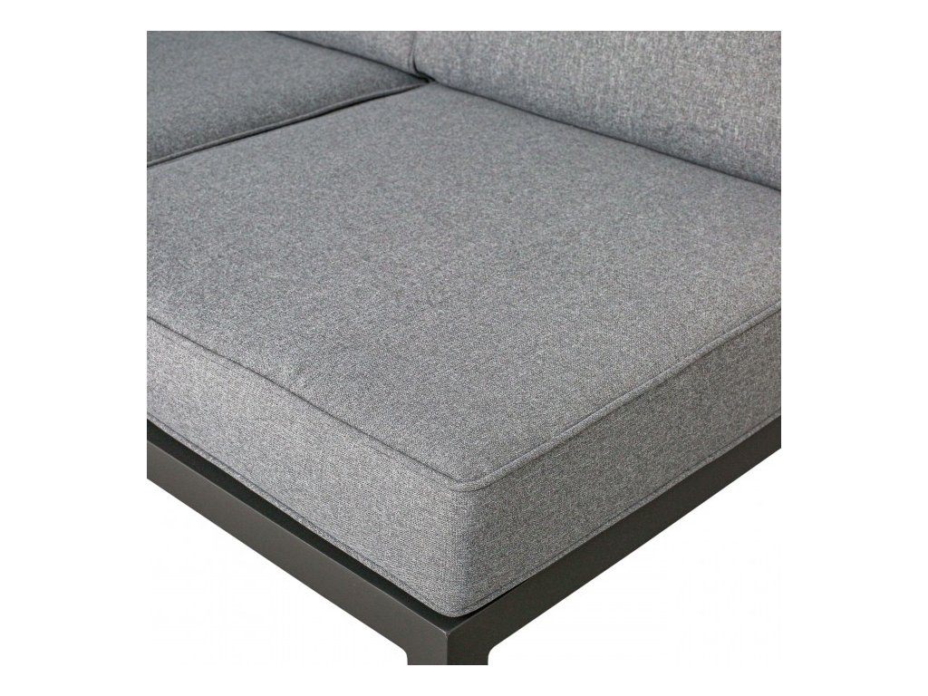 Zostava je vyskladaná z viacerých prvkov: pravého aj ľavého ramena dvojmiestnej sedačky, centrálneho rohu so sedeniami, lavice a funkčného stola. Spoločne vytvárajú harmonickú a komfortnú zónu, ideálnu na stretnutia s rodinou alebo priateľmi, pričom svojím prevedením zvýraznia charakter akéhokoľvek moderného exteriéru.