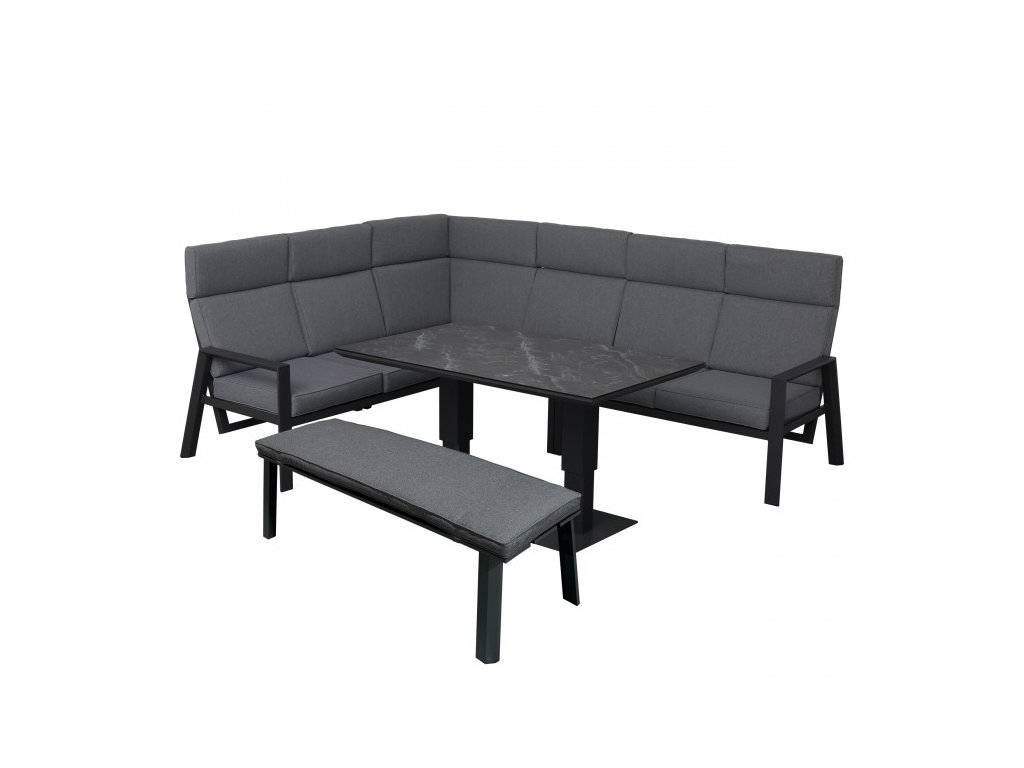 Výhody produktu: moderný vzhľad, pevná hliníková konštrukcia, praktický zdvíhací stôl, komfortné čalúnenie, variabilné sedenie, štýlový doplnok pre terasy a záhrady.